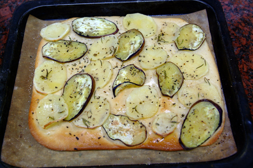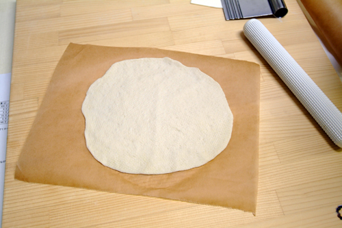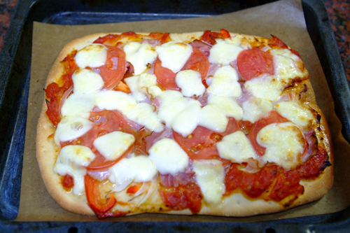 トマトソースから作り、新タマネギのスライスとハムとモッツァレラチーズのトッピング