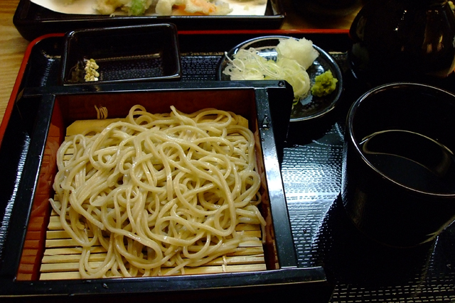 熱々に揚がった天麩羅がやってきて、間髪入れずに、サラシナがやってきた。サラシナは、ゆで時間が短いので、まず先に湯がき上がってくる様子。