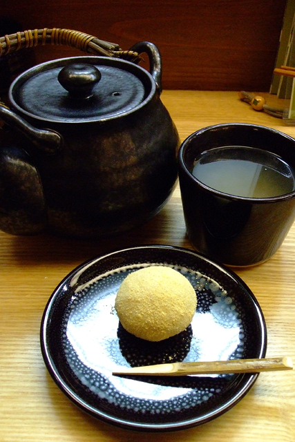 天麩羅の準備をしている最中に、小鍋で蕎麦がき(ソビガキ)きを作り始めて、練って練って練って練って練って。その場で餡を埋め込み、きなこをまぶして、冷蔵保存していた。