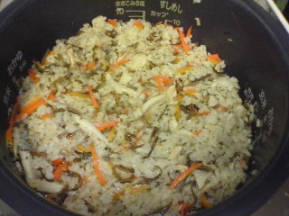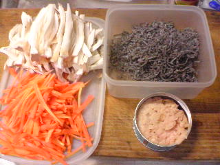 ニンジンの千切りを適当量、キノコ(本日はエリンギを用意いたしました)を手で裂いたモノを適当量。汐ふき昆布90g(2袋分)、ツナ缶小(油切りしたもの)は、混ぜご飯の材料になります。この量は、6合分です。汐ふき昆布1袋(45g程度)が3合と覚えてくださいませませ。