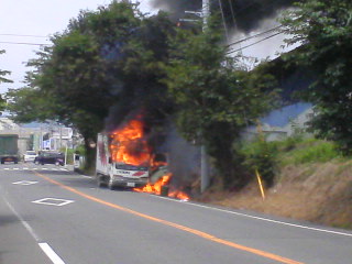 見ている間に、炎がトラックを舐め全焼。そんな頃に消防が来てもねぇ…。
