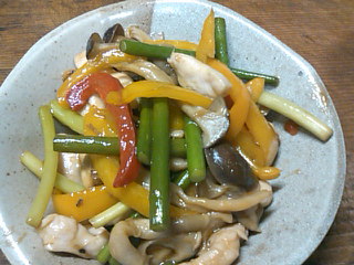 カラーピーマンとシメジ、鶏のササミを縦長に切り炒めてみました。