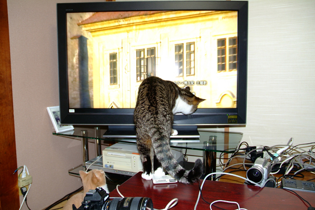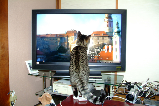 T「ちょっとしたものでも映し出されるよね。なにせフルスペックのハイビジョンテレビだからな。それにな、パソコンも接続できるんだよ。ここネコジルシがデカイデカイ。パソコン用のモニターが17インチだったから、なおさら驚いてるよ。それに、このデカイので1台二役なんで、便利便利。」